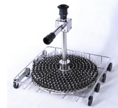 ID0162籃架噴針細(xì)以≤3mm為主,均勻分布在大圓盤的分流盤面上。噴淋桿和玻璃器皿一對(duì)一高效噴淋,多用于集中清洗同一規(guī)格的進(jìn)樣瓶、離心管、小試管等。